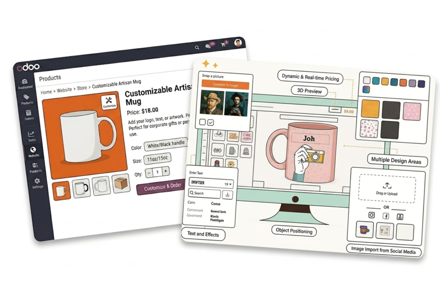 ✓ PrintXpand adds a full product personalisation layer to your Odoo eCommerce store — customers configure and approve their design before the order reaches your production team