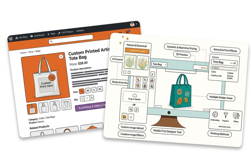 A WooCommerce store running 25 plugins is normal. Add a product designer and it conflicts with your caching plugin, page builder, or checkout extension. Three vendors, three support queues, nobody owns the problem.
